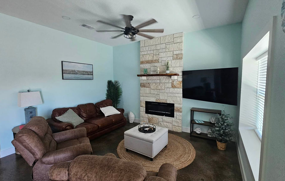 This unique property has an out in the country peaceful feel, yet it is 8 minutes from the beach, 5 minutes from shops & restaurants. Newly built, fresh and beautifully decorated. This is a 3-bedroom, 2- bathroom, open concept kitchen and living room. It has a great front porch with seating with table for relaxing after a long day on the beach or fishing. Master bedroom has ensuite bathroom and King bed. Second bedroom has a queen bed. Third bedroom has 1 bunk bed (twin/full), 1 twin sleeper sofa. Hallway guest bathroom. Hallway closet washer/dryer. Living room has a fireplace. Dining area has dining table for 4 and 4 bar stools along the island.